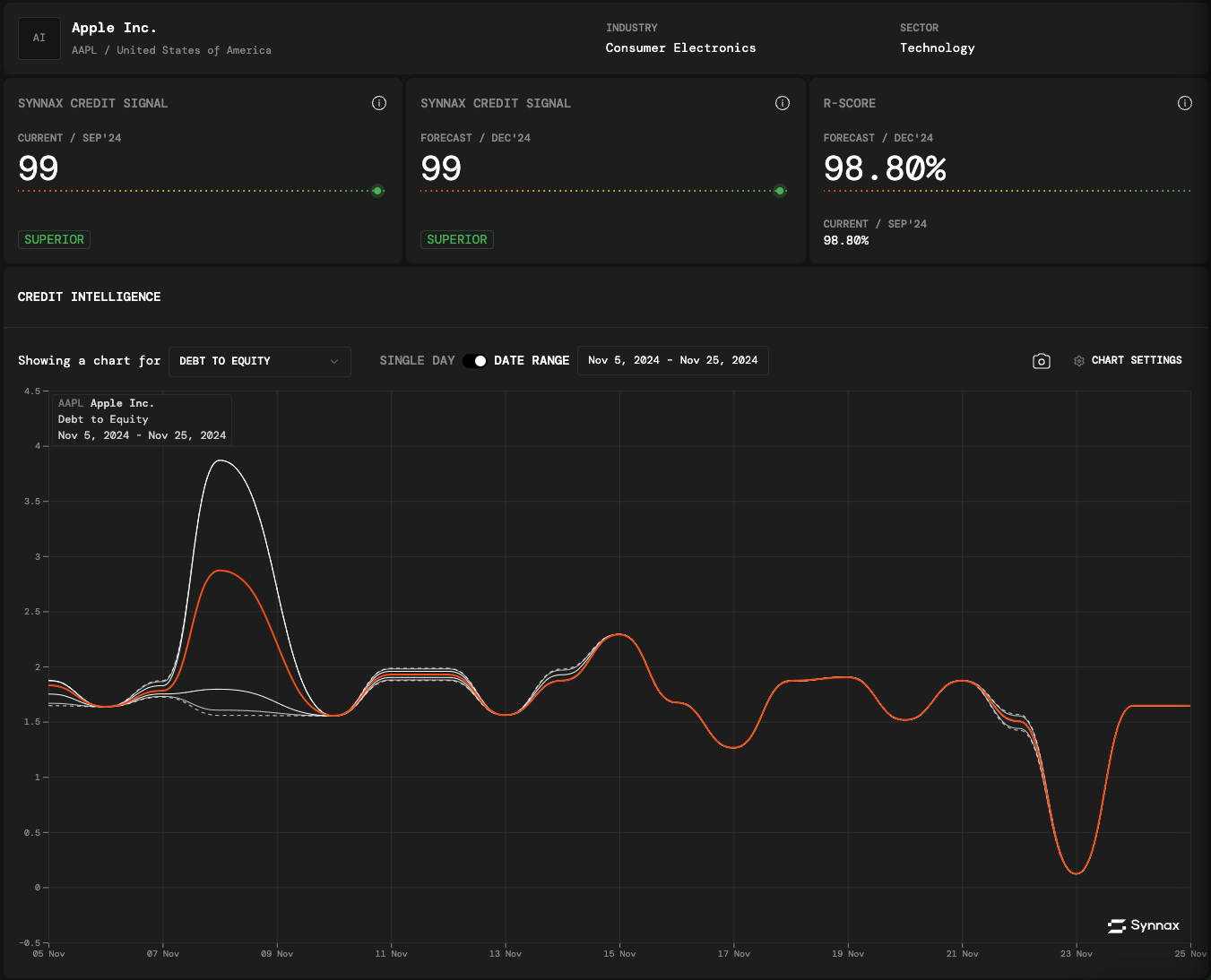 Credit Intelligence encompasses real-time, predictive financial metrics from each machine learning model, offering a more comprehensive view of a company’s financial performance. Credit Intelligence comprises: